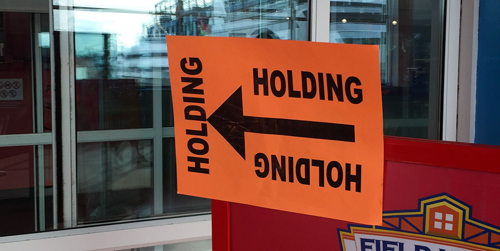 Orange sign with left pointing arrow and word holding